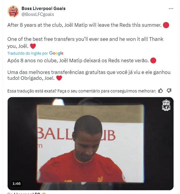 O Liverpool anunciou que mais um atleta deixa o clube contra o Wolverhampton no próximo domingo (19), às 12h (de Brasília). Além de Thiago Alcântara e Jürgen Klopp, o camaronês Joel Matip sairá do Reds.