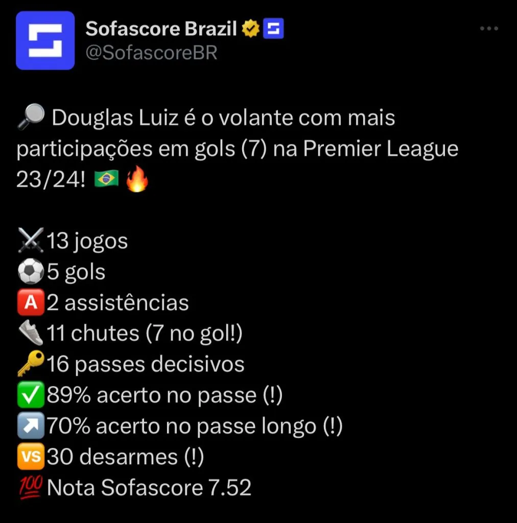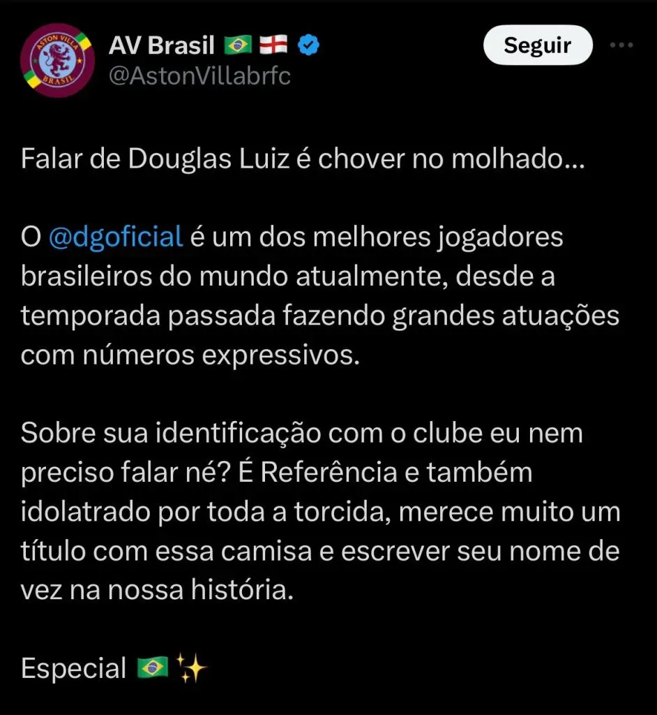 O meio-campista Douglas Luiz hoje é um dos principais destaques do Aston Villa, e por isso, desperta interesse de diversas equipes que brigam pelo título da Premier League.