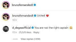 Isso porque, após o jogo, Bruno Fernandes fez uma publicação em seu Instagram comemorando os três pontos conquistados, escrevendo: “United”, e um emoj de coração vermelho. Mas nos comentários, De Gea, ex-goleiro da equipe, não se escondeu e escreveu: “Você não é o capitão certo”, com emoji de uma carinha com zíper na boca.