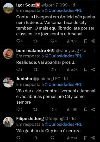 Desta forma, ainda assim fica atrás dos três que estão na disputa pelo topo da tabela de classificação. O Arsenal vem de cinco vitórias consecutivas, enquanto os Reds tem quatro e o City três em cinco confrontos.