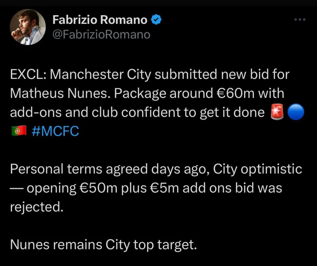 Segundo informações do jornalista Fabrizio Romano, o Manchester City teria feito nova oferta para contar com o meio-campista português Matheus Nunes.