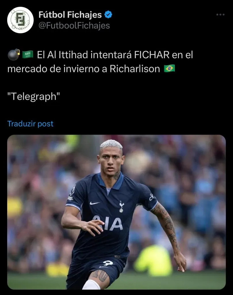 Mesmo em má fase, Richarlison é visto como peça importante no Tottenham, e o time inglês não quis abrir conversas com o Al-Ittihad na última janela. Atualmente no site transfermarkt, o brasileiro tem valor de mercado estimado em 48 milhões de Euros.