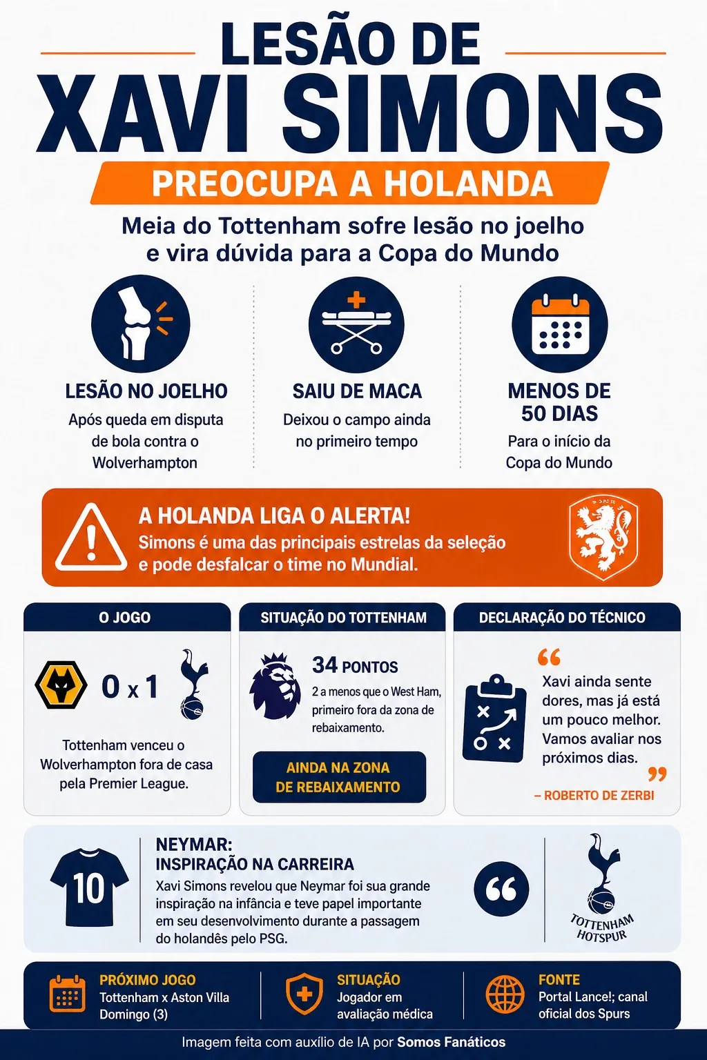 O Tottenham enfrentou o Wolverhampton fora de casa, neste sábado (25), pela Premier League, e os Spurs venceram por 1 x 0, mas o meia-atacante Xavi Simons sofreu uma lesão e saiu de maca do campo.