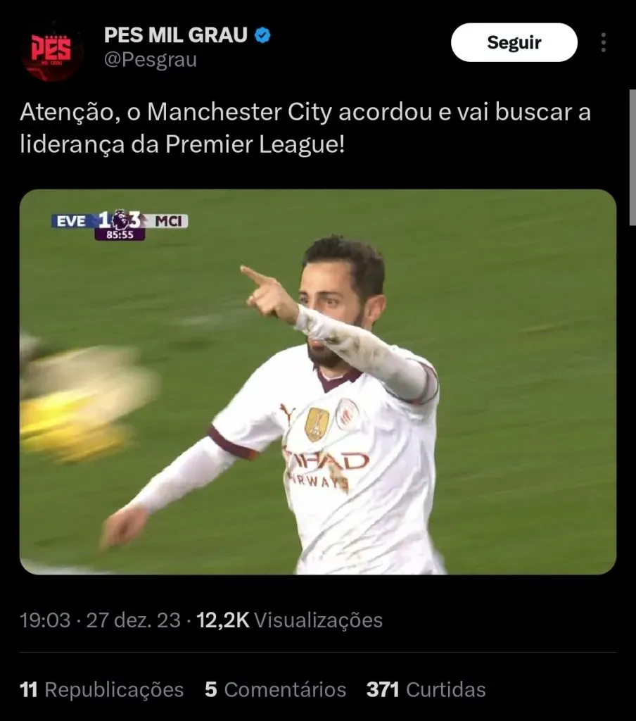 Já nos momentos finais da partida, Pickford, que era o melhor jogador do Everton, tentou sair jogando mas acabou errando o passe. A bola sobrou no pé de Bernardo Silva, que bateu por cima e ampliou o placar para três a um.