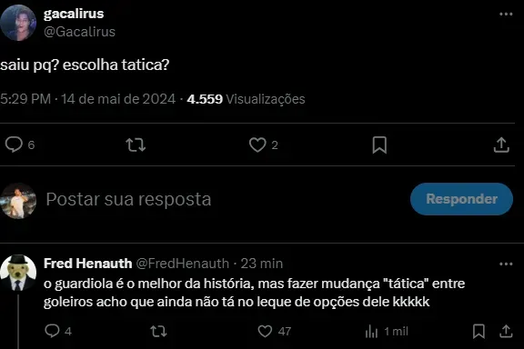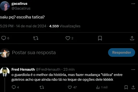 A reação do goleiro acabou sendo surpreendente e certamente vai gerar alguma cobrança de Pep no vestiário agora que o duelo terminou, em Londres. O banco de reservas deu suporte ao jogador.