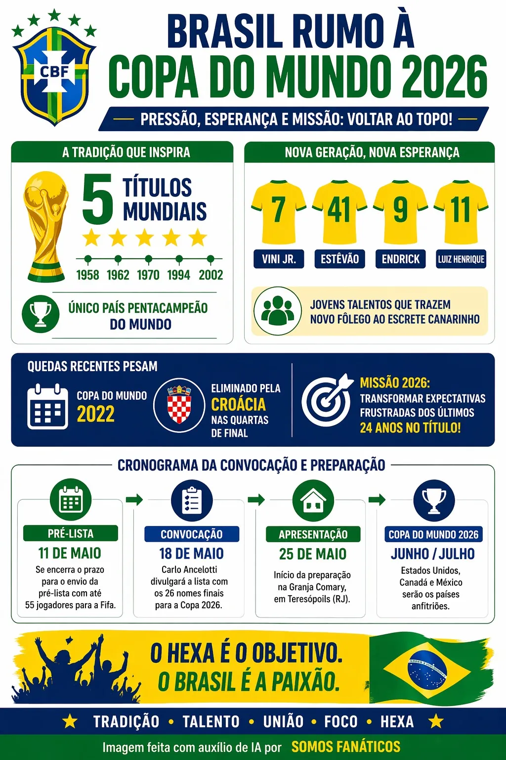 A convocação da Seleção Brasileira para a Copa do Mundo de 2026 acontece no dia 18 de maio. O técnico Carlo Ancelotti divulgará a lista com os 26 nomes finais para a disputa do Mundial.