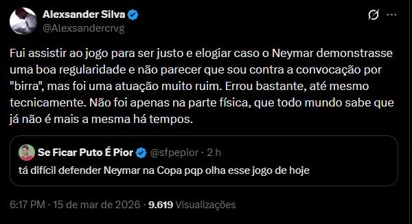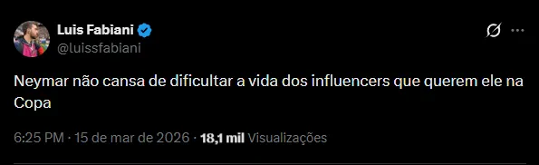 Nas redes sociais, a possibilidade de uma ida para a Copa do Mundo foi motivo de debate entre os Fanáticos. Os torcedores estão completamente decepcionados e acreditam que ele não merece uma nova chamada para a Seleção Brasileira.