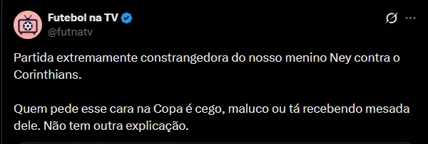 Nas redes sociais, a atuação de Neymar contra o Corinthians foi motivo de debate entre os Fanáticos. A péssima partida do jogador pegou de surpresa à vários fãs, que se sentiram decepcionados com o seu desempenho.