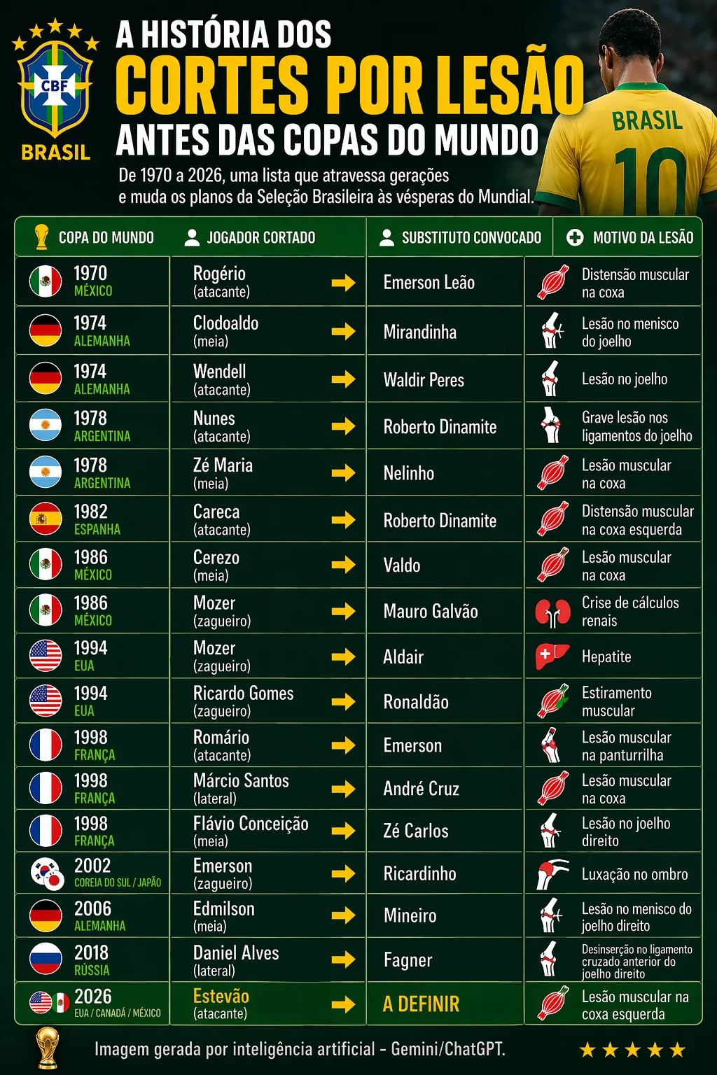 Cortes por lesão na Seleção Brasileira ao longo das Copas