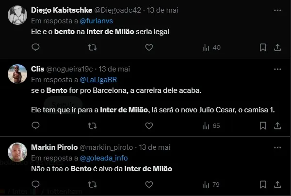 “Estamos felizes com os goleiros do elenco, mas pensando no futuro, Bento é um dos que estamos avaliando. Muito está sendo considerado por conta da convocação para a seleção brasileira, mas mesmo que seja é prematuro falar dele, pois trata-se de um dos, dois ou três, jovens que acompanhamos com atenção”, disse.