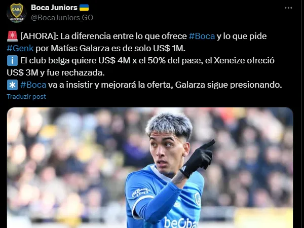 O executivo já tinha oferecido US$ 3 milhões por Matías Galarza, camisa 10 do Genk, da Bélgica. No entanto, os belgas pediram para que o Boca Jrs pudesse aumentar a oferta.