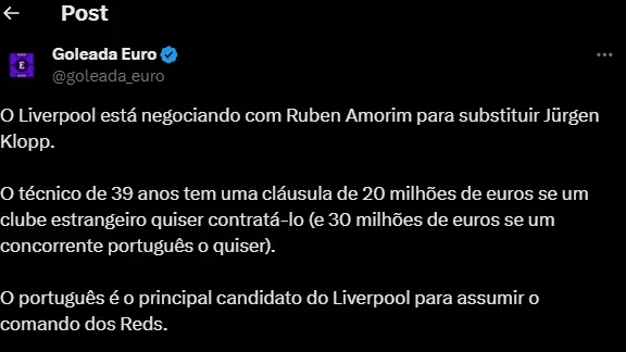 O substituto de Klopp no Liverpool pode ser Ruben Amorim se os ingleses aceitarem pagar a multa rescisória do treinador diante do que pede a diretoria do Sporting.