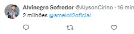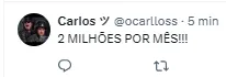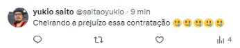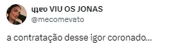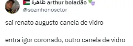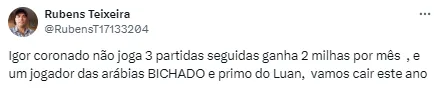 “2 milhões por mês, pra ter jogador um jogo sim um jogo não. Parabéns aos envolvidos, e tinha gente comparando com Jadson. Isso passa na mão na cara do torcedor e com dinheiro do clube que já não tem”;