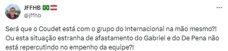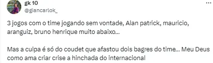 O treinador comentou que não era questionado sobre questões táticas quando vinha de uma série de vitórias. Ele reconheceu que a atuação foi abaixo, mas fez questão de ressaltar que possui apenas uma derrota no ano.