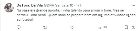 “Hoje me despeço do clube que amo, Santos Futebol Clube. Foram 17 anos vestindo essa camisa, clube em que cheguei uma criança cheia de sonhos e saio hoje um homem que realizou alguns deles. Primeiramente gostaria de agradecer a Deus e a TODOS os funcionários que ao longo desses anos, contribuíram para o meu crescimento seja ele dentro ou fora de campo! Hoje saio de cabeça erguida que dei o meu melhor durante esse tempo no clube. E nas poucas oportunidades que tive no time de cima, mesmo passando por situações absurdas dentro do clube! Fica aqui meu agradecimento a cada um dos companheiros de clube e amigos que fiz aqui dentro. Seguirei SEMPRE na torcida pelo clube e que ele volte pra onde nunca deveria ter saído! Gratidão