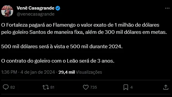 Com saída iminente para jogar no terceiro clube da carreira, o Fortaleza, o goleiro Santos está sendo vendido por valores que podem chegar no máximo a R$ 6,4 milhões na cotação atual.