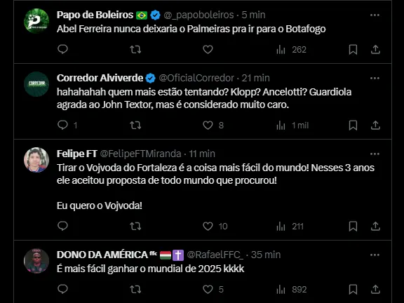 “Os estrangeiros Juan Pablo Vojvoda e Pedro Caixinha, que trabalham hoje em Fortaleza e Red Bull Bragantino, são bem cotados entre os membros da cúpula alvinegra”, destaca a publicação.