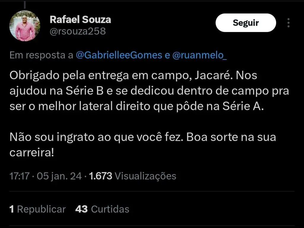 Jaca, como ficou conhecido, estará rescindindo seu contrato com a equipe em breve. Ele já aceitou a proposta do time mineiro, e estará confirmando sua transferência em breve.