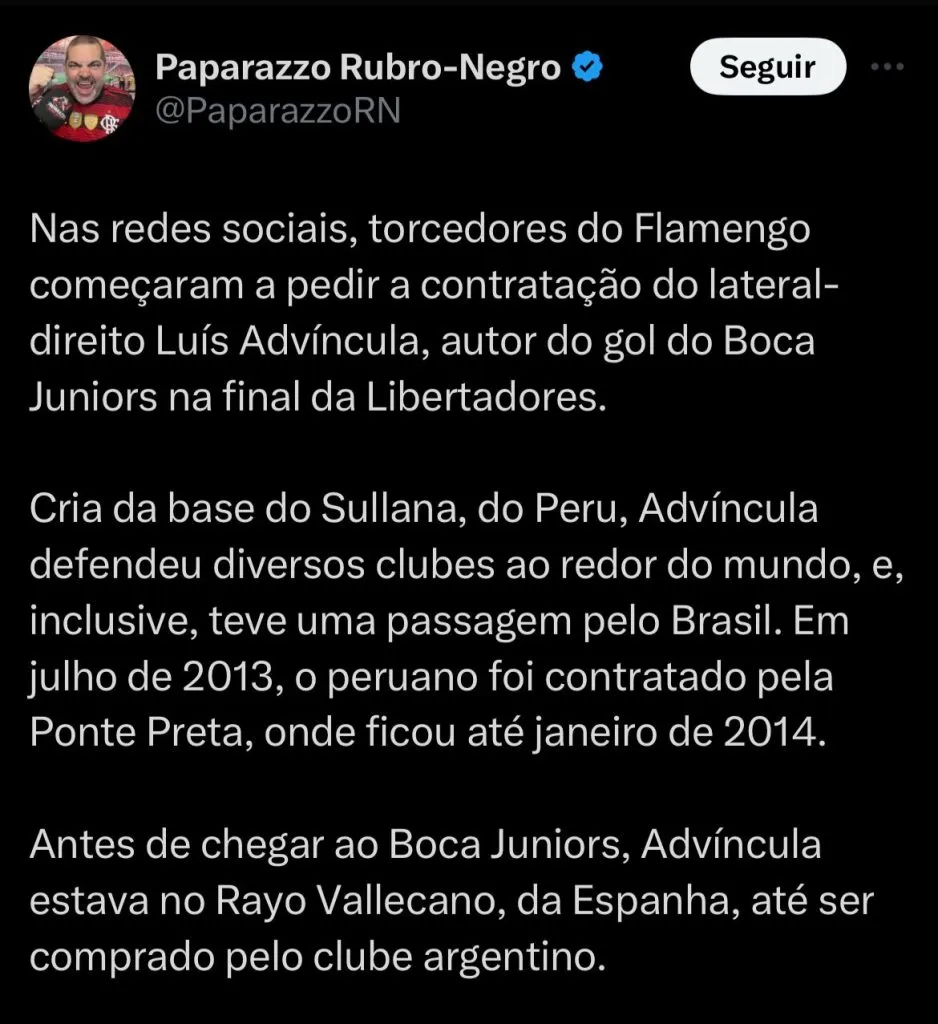 Advíncula é jogador do Boca Juniors desde 2021 e com 33 anos atualmente, já passou por diversas equipes do Futebol Mundial, incluindo a Ponte Preta no Brasil.