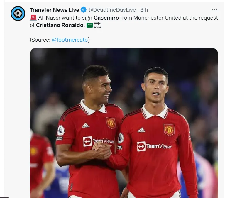 De acordo com informações do portal Foot Mercato, o Al Nassr está interessado em Casemiro após pedido de Cristiano Ronaldo. Eles eram companheiros em tempos de Real Madrid e por lá viveram grande auge.