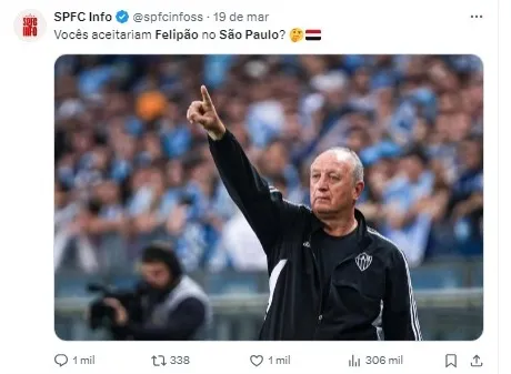 “Por isso, perguntar não ofende: Felipão virará agora uma grande sombra para Thiago Carpini no São Paulo? Pela falta de opções no mercado, eu sinto que sim!”, afirmou.