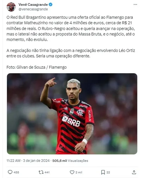 Inicialmente, a proposta do Massa Bruta não envolvia outros atletas, mas o Flamengo tinha a intenção de incluir Matheuzinho na negociação para contratar Léo Ortiz e Juninho Capixaba.