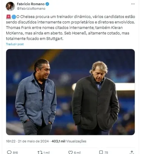 Enquanto o clube londrino busca por um novo treinador, o “Telegraph” sugere quatro nomes que podem assumir o comando do Chelsea: Sebastian Hoeness, Míchel, Kieran McKenna e Enzo Maresca.
