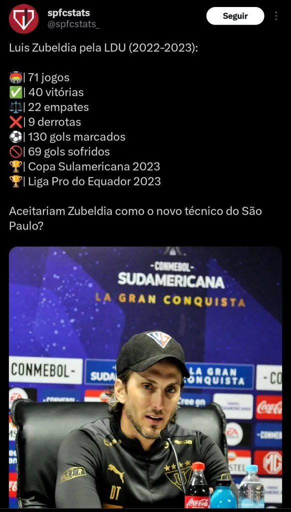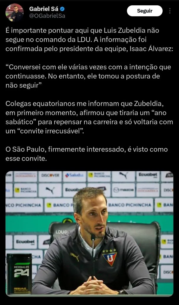 O GE informa que o São Paulo iniciou as negociações com o técnico Luis Zubeldia, que atualmente comanda a LDU.