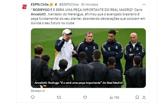 Durante a entrevista coletiva neste sábado (31), Ancelotti abordou os rumores que sugerem a possível saída de Rodrygo do clube merengue, alimentados por declarações mal interpretadas durante o media day da equipe.