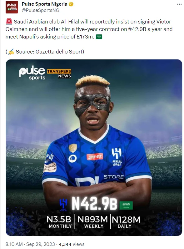 No entanto, apesar do interesse de equipes de alto nível na Europa, segundo o Gazetta dello Sport o Al-Hilal, da Arábia Saudita, ainda está determinado a adquirir o talentoso jogador de 24 anos. Relatos sugerem que o clube saudita estaria disposto a oferecer um contrato de cinco anos a Osimhen.