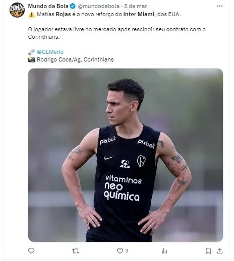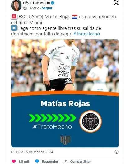 A informação sobre o novo clube do jogador foi divulgada pelo jornalista César Luis Merlo, que afirmou: “Matías Rojas é o novo reforço do Inter Miami. Chega como agente livre após deixar o Corinthians por falta de pagamento”.