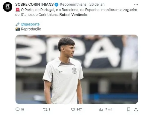 Um dos promissores talentos da base do Corinthians, está no radar de clubes europeus, com Barcelona e Porto demonstrando interesse no jogador.