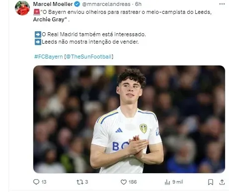 Segundo informações do jornal inglês “The Sun”, os dois gigantes europeus estão de olho em Archie Gray, meio-campista do Leeds que é considerado a futura grande estrela da Premier League.