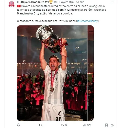 O contrato de Kilicsoy com o Besiktas é válido até 2028, mas o clube turco está disposto a negociar o jovem talento por cerca de 22 milhões de libras (aproximadamente R$ 145,2 milhões).