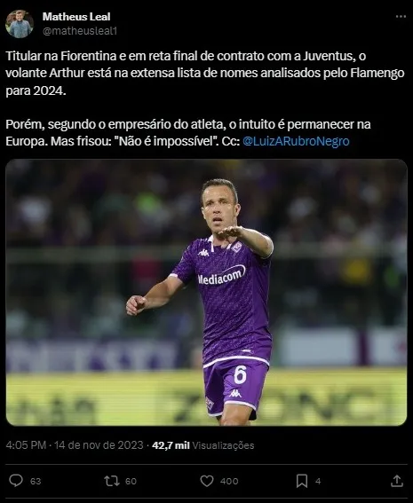 Arthur está na Europa desde que deixou o Grêmio para atuar no Barcelona, passando depois por Juventus, Liverpool e, agora, Fiorentina. O acordo com a Velha Senhora é válido até junho de 2026.