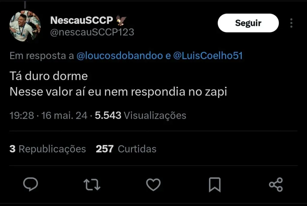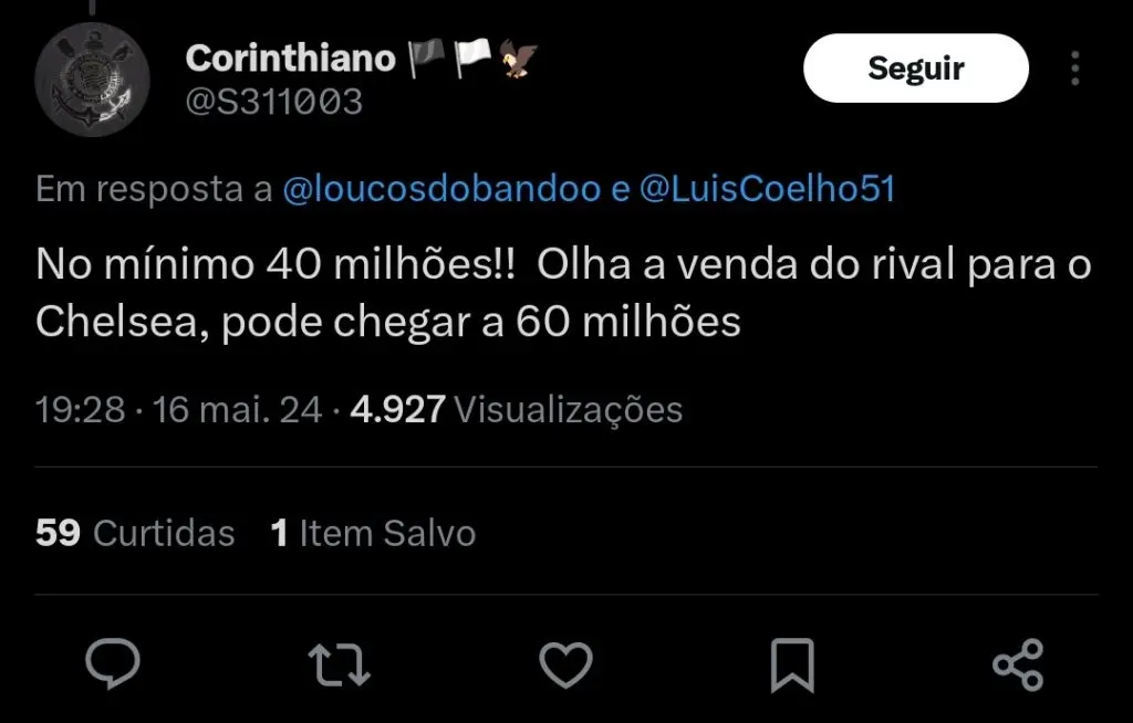 Ainda segundo a fonte, eles avaliam fazer uma proposta milionária para poder concretizar a aquisição do jogador do Corinthians.