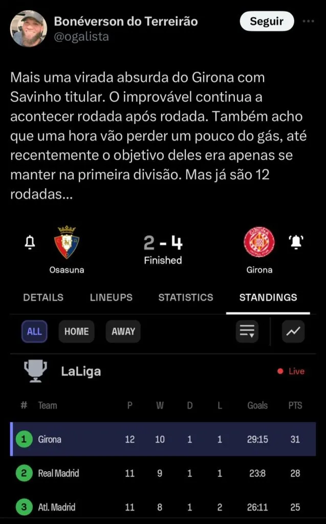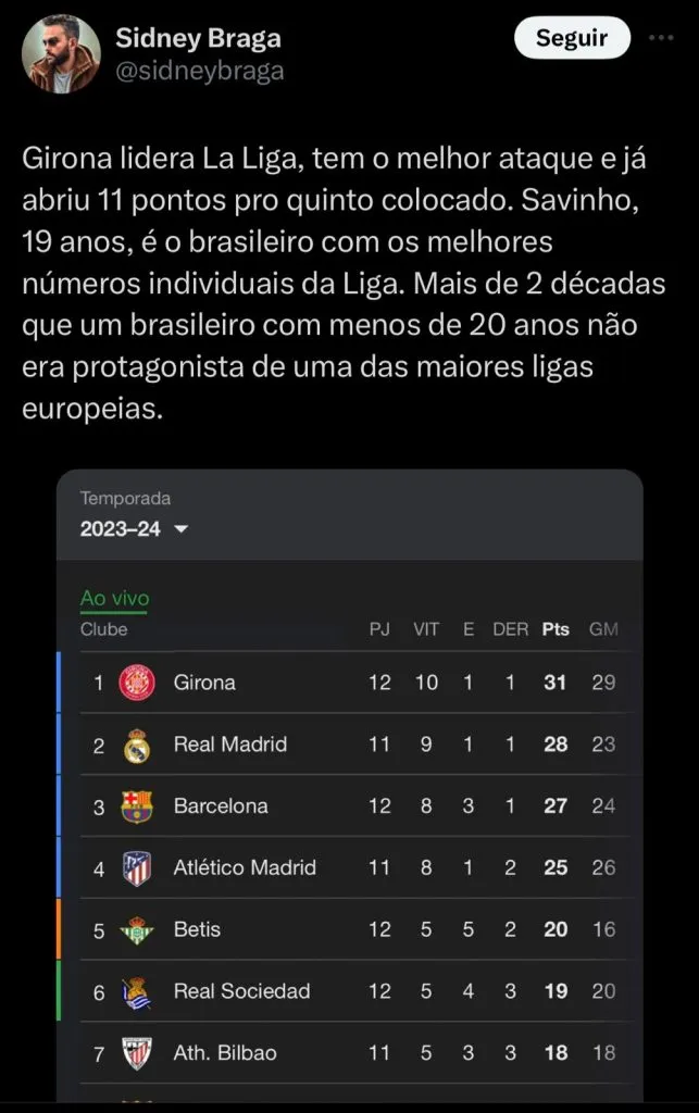 Atualmente, o Girona faz campanha histórica na LaLiga, ocupando a primeira posição e desbancando Real Madrid e Barcelona. No Girona, Sávio disputou 13 partidas, marcando 4 gols e 4 assistências.