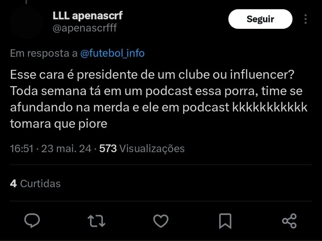 Nesta semana, ao ser perguntado sobre a possibilidade de contratar o atacante, o presidente do Alvinegro, Augusto Melo, abriu o jogo.