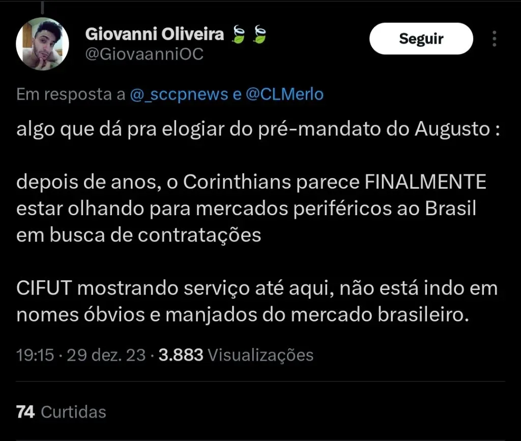 Sobre nova direção para a próxima temporada, o Corinthians passará por um grande processo de mudanças em seu elenco. O clube paulista não teve um bom ano, e pensa em reverter está situação em 2024.