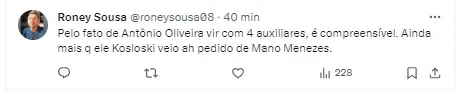 A decisão acontece um pouco mais de um mês da contratação do ex-treinador do Coritiba e que comandou o time interinamente na derrota para o Santos por 1 a 0. O clube ainda não anunciou a saída até a publicação desta matéria, mas Kosloski se despediu do clube nas redes sociais.