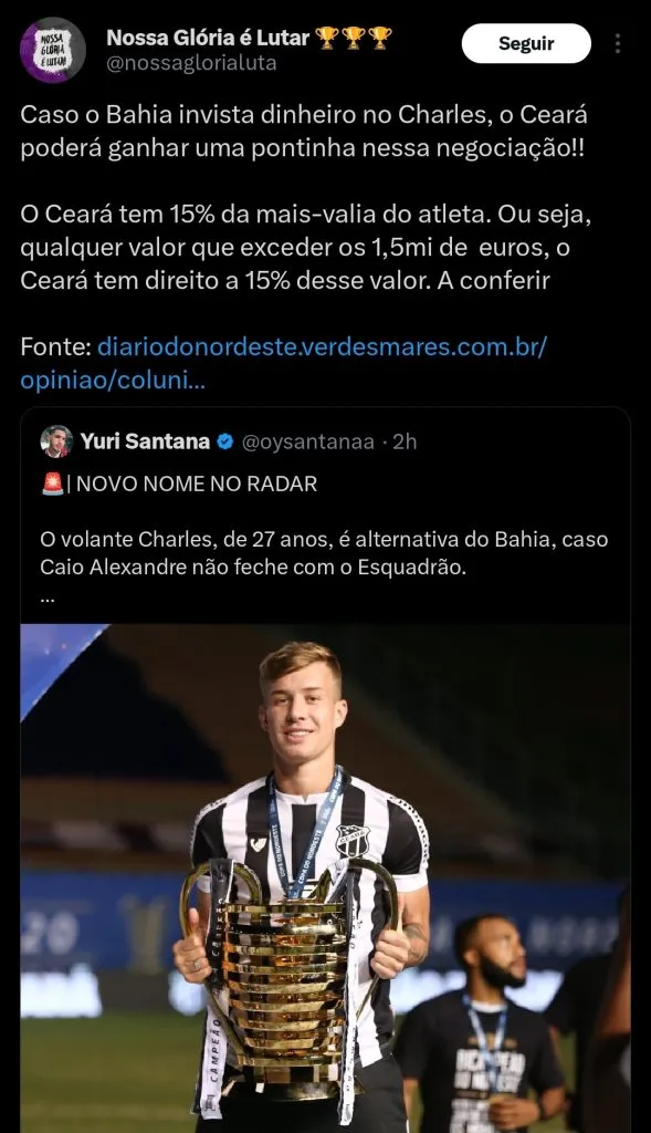 No momento, o tricolor baiano não realizou nenhuma proposta pela contratação de Charles. Os dirigentes aguardam o desenrolar das negociações com Caio para definir se irão avançar nas tratativas pelo jogador do futebol europeu.