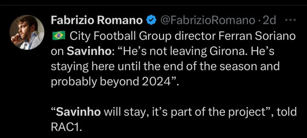 O diretor de futebol do City Group, Ferran Soriano, falou sobre a possibilidade da saída de Savinho. O diretor garante que Sávio segue no Girona em 2024 e faz parte do projeto do clube.