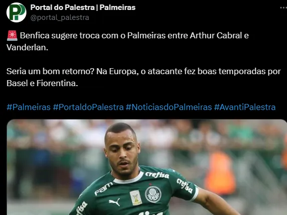 O Portal Palmeiras, que trouxe em primeira mão o negócio por Wesley Dual, do Barcelona, atualiza que Arthur Cabral é oferecido pelo Benfica ao Verdão em troca de Vanderlan.
