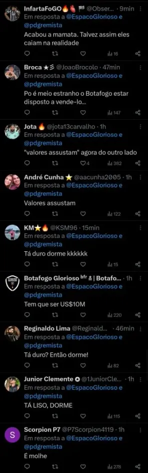 Junior Santos interessa ao Grêmio. O Botafogo não facilita o negócio e aceita negociar pelo valor que entende ser o válido pelo atleta do time comandado pelo técnico Tiago Nunes. Renato Portaluppi dá o aval para que o jogador possa reforçar o Imortal em 2024.