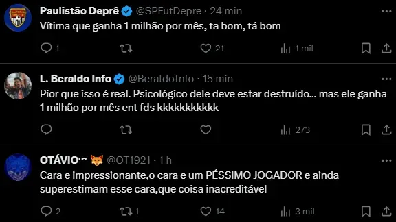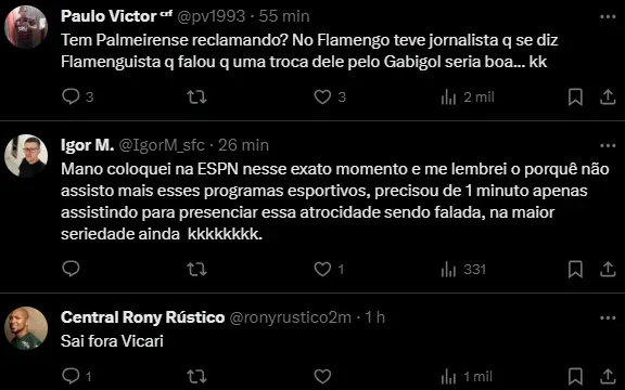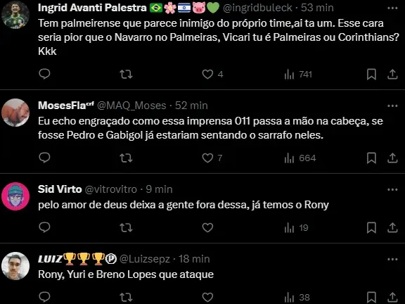 Vicari vai alé: “Sabe um lugar que eu acho que ele brilharia e está procurando um jogador como ele? No Palmeiras. Ele não é essa piada e esse meme que estão pintando”, finalizou.