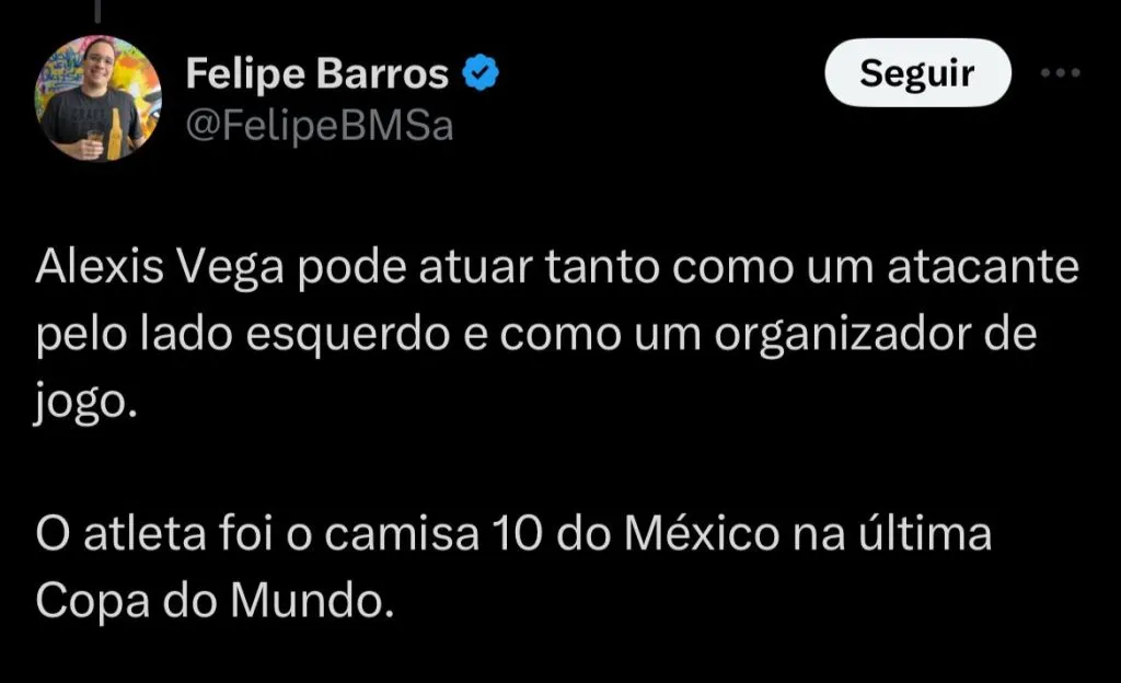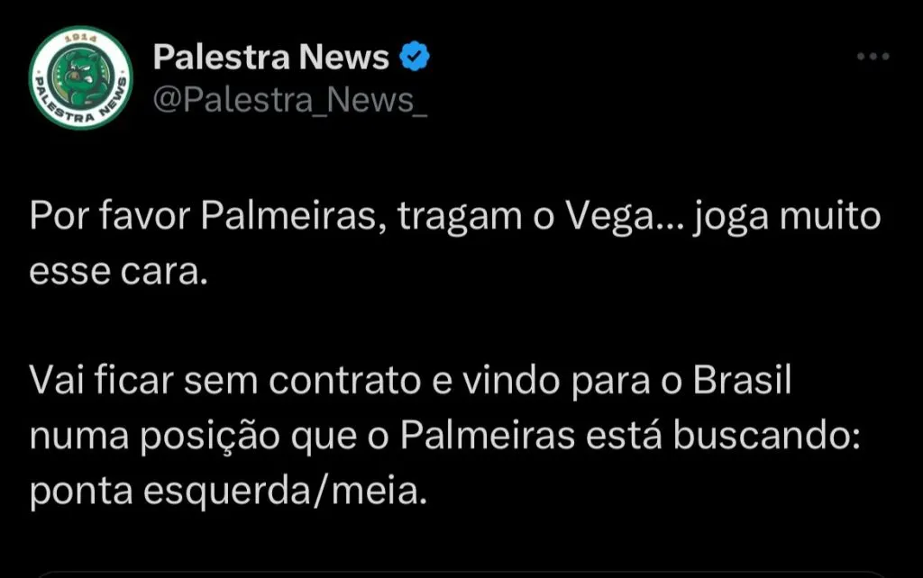 “Por favor Palmeiras, tragam o Vega… joga muito esse cara. Vai ficar sem contrato e vindo para o Brasil numa posição que o Palmeiras está buscando: ponta esquerda/meia”, afirmou o portal de notícias.