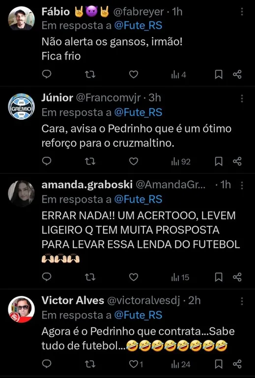 A maioria dos comentários são de gremistas querendo que o atleta não utilizado pelo técnico Renato Portaluppi deixe o plantel da equipe de Porto Alegre. Ele não é inegociável devido a situação no comando do ídolo do clube.