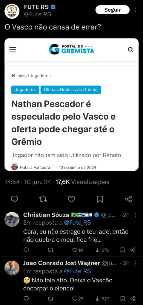 Enquanto um perfil publicou o print da manchete com a pergunta “O Vasco não cansa de errar?”, outros internautas aproveitaram para falar que seria um baita negócio para o Almirante.