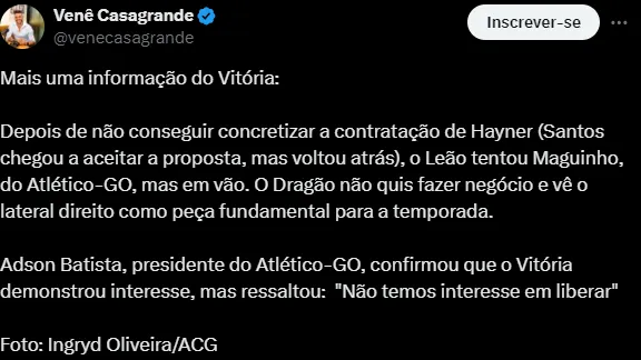 Há um consenso interno que Hayner é esforçado e a disciplina dele é um diferencial para o “fico” ser concretizado no CT Rei Pelé. Desta forma, nada de Vitória ou Atlético-GO.