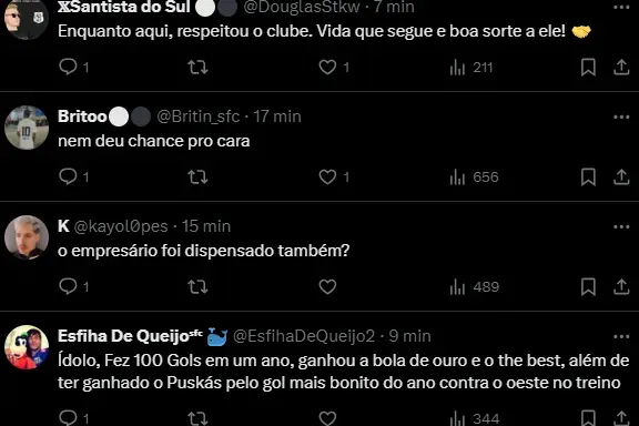 Nesta quarta-feira (10), o Santos anunciou a rescisão amigável com o atleta emprestado pelo time mineiro. Os torcedores pedem mais adeus até o início da segundona.